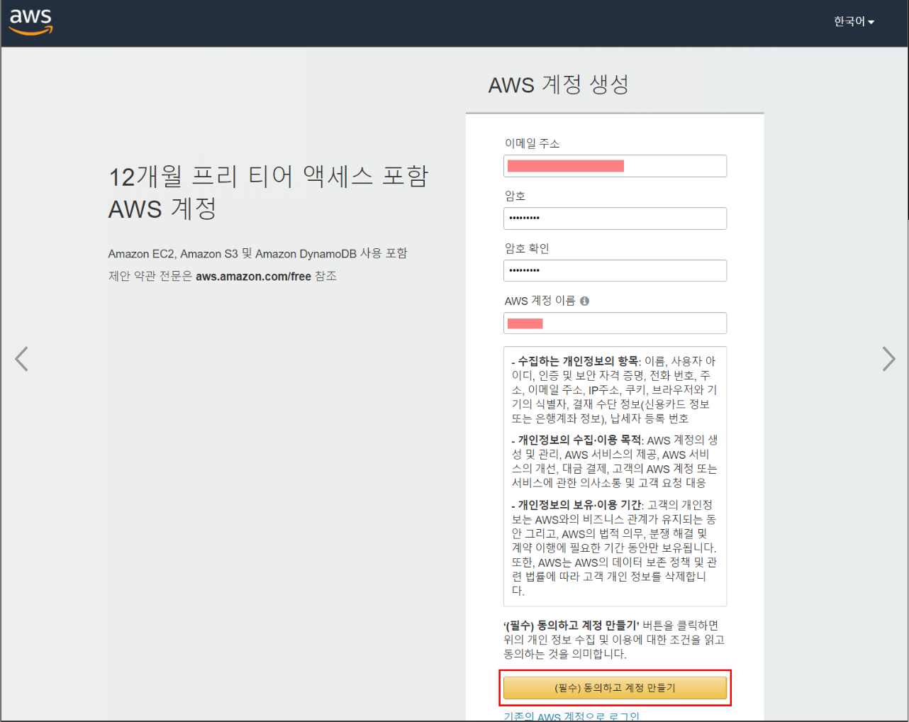 0 2 ) AWS 계정 생성 페이지로 들어옵니다.
